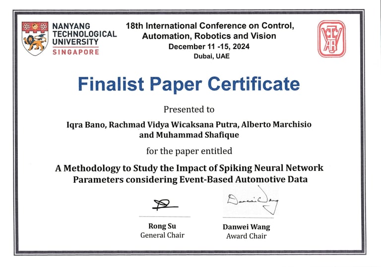 13 December, 2024: Our paper titled "A Methodology to Study the Impact of Spiking Neural Network Parameters considering Event-Based Automotive Data" ranked as a finalist for the Best Paper Award at 18th International Conference on Control, Automation, Robotics and Vision (ICARCV) 2024. Congratulations to all the co-authors!